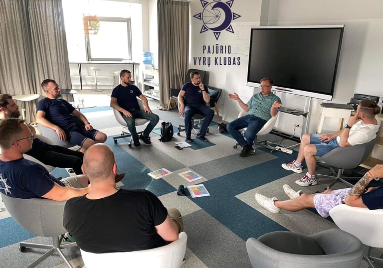 Kuriame erdvę, kurioje vyrai gali laisvai dalintis savo išgyvenimais, būti autentiški ir išdrįsti būti atviri prieš save ir kitus.